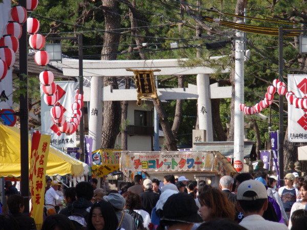 猪名野神社では、秋に宮前祭りが開催 されます。 平成21年10月10日にムクロジの木に 実がついている写真を撮ろうと 猪名野神社を訪れると、 参道にはお店がたくさん並び、 多くの参拝客で賑わっていました。 |