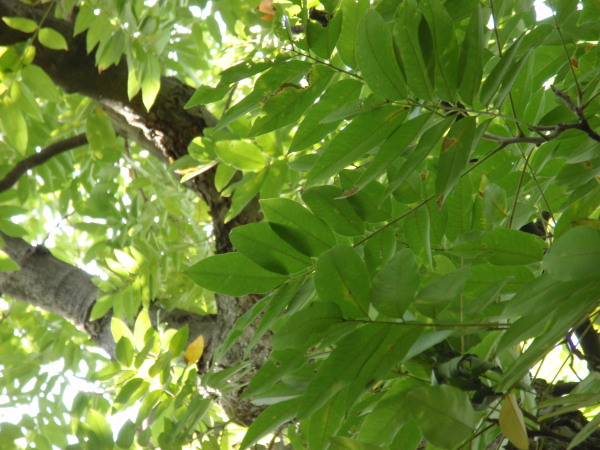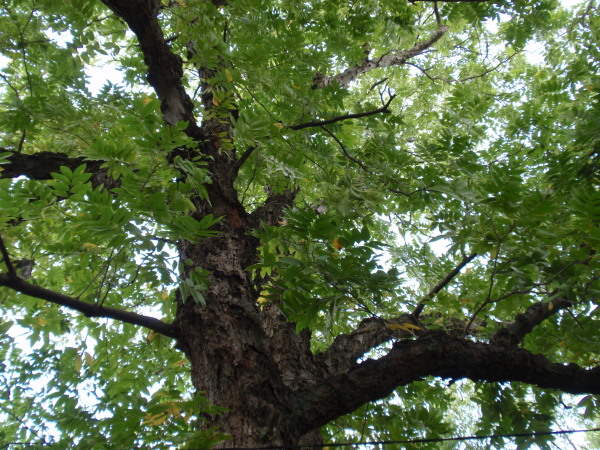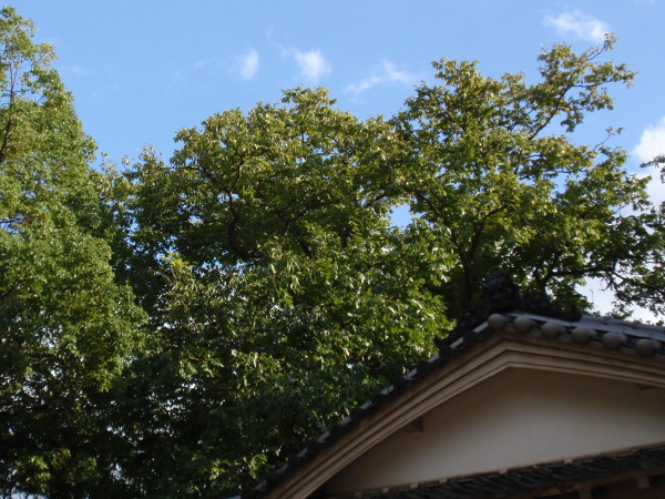 2009年10月10日 ムクロジの木の下から見上げると、 秋の昼下がりの日差しを浴びて、 ムクロジの特徴的な葉が風にゆれていました。 数日前に近畿地方を通過した台風18号の 風に吹き飛ばされたのか、ムクロジの木に 実は残っていませんでした。 雨と風に洗われて、葉の一枚一枚が みずみずしく輝いて見えます。 黄葉がはじまりかけているようです。 |
